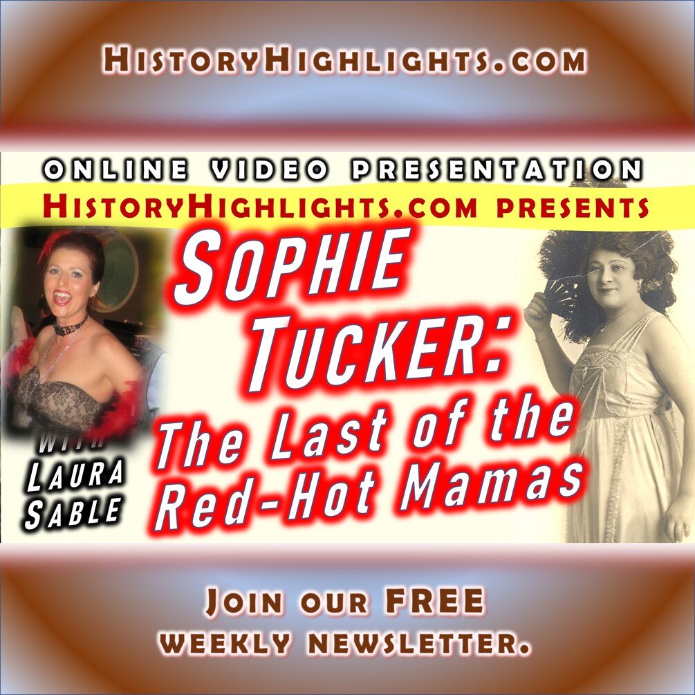 In this 22-minute History Highlights Series online multimedia presentation, join Laura Sable to explore the fascinating story of one of the most popular American entertainers during the first half of the 20th century. Sophie Tucker was known for her powerful delivery of comical and risqué songs, her unabashed straight-forward performing style, and her exceptional generosity. Her diverse career started in vaudeville and burlesques shows and evolved to recordings, radio, television, and movies. Laura closes the presentation with a musical performance of the great "Last of the Red Hot Mamas" song that was a hit for Sophie in the 1920s.